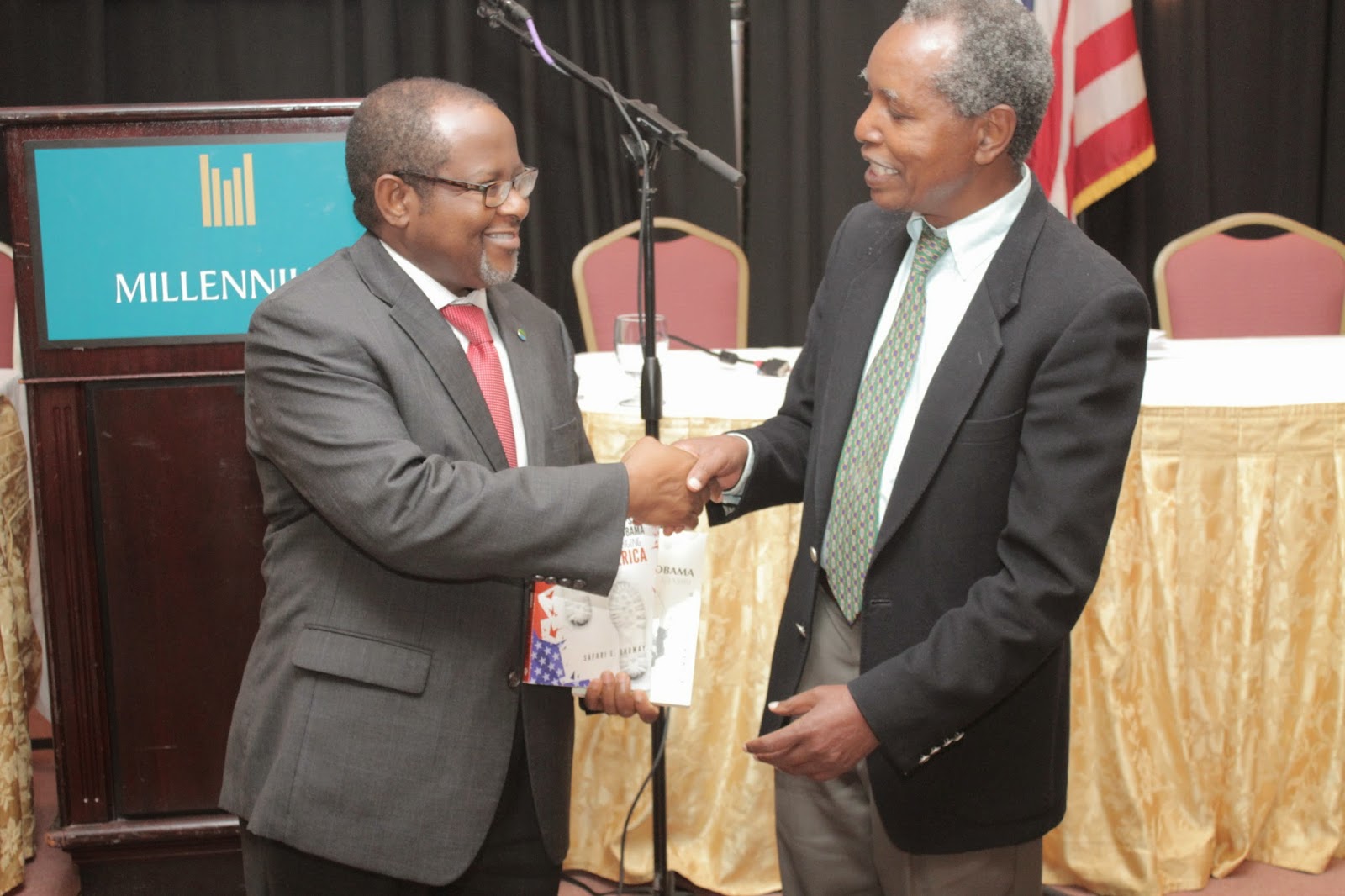 Katibu Mkuu Kiongozi Balozi Ombeni Sefue akipokea nakala ya kiswahili na kiingeraza ya kitabu cha nyayo za Obama kutoka mwandishi wa kitabu hicho Mzee Safari Ohumay kwenye siku ya Jumamosi Oct 4, 2014 kwenye mkutano wa DICOTA 2014 uliofanyika Durham, North Carolina.