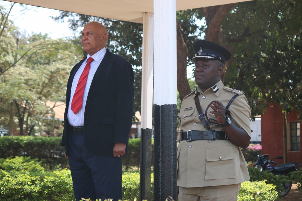Mkuu wa Mkoa wa Kilimanjaro,Said Mecky Sadiq akipokea salamu za heshima kutoka kwa askari wakati wa gwaride maalum lililoandaliwa wakati wa hafla fupi ya kutunuku zawadi kwa askari 34 wa vyeo mbalimbali waliotekeleza vyema majukumu yao.kulia ni Kamanda wa Polisi Mkoa wa Kilimanjaro ,Wilbroad Mutafungwa.