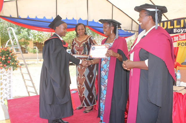 Mhandisi wa Teknolojia ya Habari na Mawasiliano Chuo Kikuu cha Dar es Salaam (COICT), Dk Suzan Lujara (wa pili kulia) akikabidhi cheti kwa Alvin Mgaya, mmoja wa wahitimu wa kidato cha nne wa Shule ya Sekondari ya wavulana ya Sullivan Provost wakati wa mahafali ya pili ya shule hiyo, shuleni hapo Kibaha kwa Mathias, Pwani hivi karibuni. Wa pili kushoto ni Mkurugenzi Mtendaji wa shule hiyo, Rachel Mwalukasa na Mhadhiri kutoka Chuo Kikuu cha Dar es Salaam Dk. Ellen Kilinga.