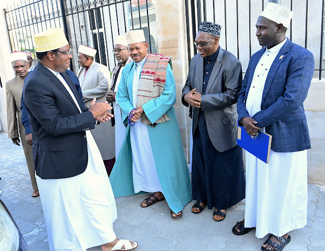 Waziri Mkuu, Kassim Majaliwa akiagana na Mufti na Sheikh Mkuu wa Tanzania, Dkt. Abubakar Zubeir bin Ally (kushoto) baada ya kushiriki katika Swala na Baraza la EiD-ADH’HAA kitaifa kwenye Msikiti wa Mfalme wa Morocco Muhammad VI uliopo Kinondoni jijini Dar es salaam, Julai 10, 2022. Katikati ni Sheikh wa Mkoa wa Dar es salaam, Dkt. Alhad Mussa Salum.