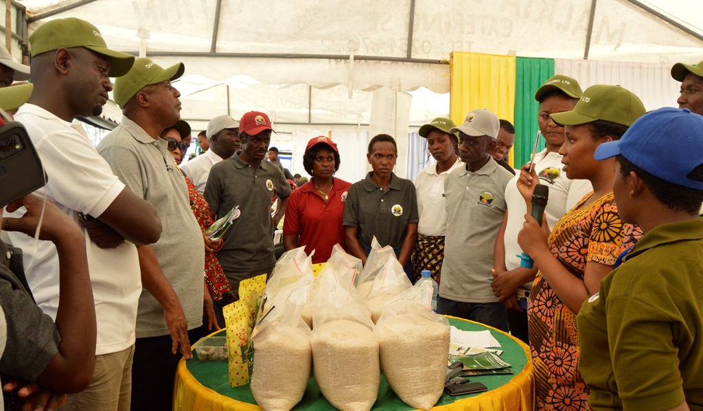 Meneja wa chama cha Ushirika wa Wakulima wa Umwagiliaji Ruvu (CHAURU) Victoria Olotu akitolea ufafanuzi kwa Mkuu wa Mkoa wa Pwani Mhandisi Evarist Ndikilo kuhusu mchele pamoja na Korosho zinazolimwa katika hilo alipokuwa anatembelea baadhi ya mabanda mbalimbali kwenye maonesho yatakayofanyika kwa siku tatu kuanzia tarehe 08 hadi tarehe 10 Oktoba, 2020.