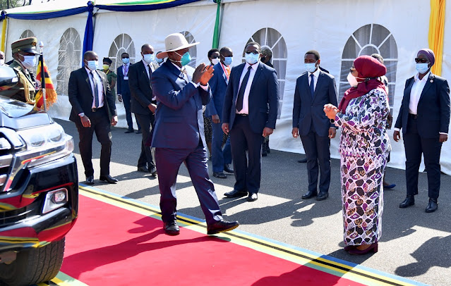 Rais wa Jamhuri ya Muungano wa Tanzania Mhe. Samia Suluhu Hassan akiwa amesimama pamoja na mgeni wake Rais wa Uganda Yoweri Museveni wakati wa nyimbo za Mataifa mawili ya Tanzania na Uganda zikipigwa katika viwanja vya Ikulu Jijini Dar es Salaam.