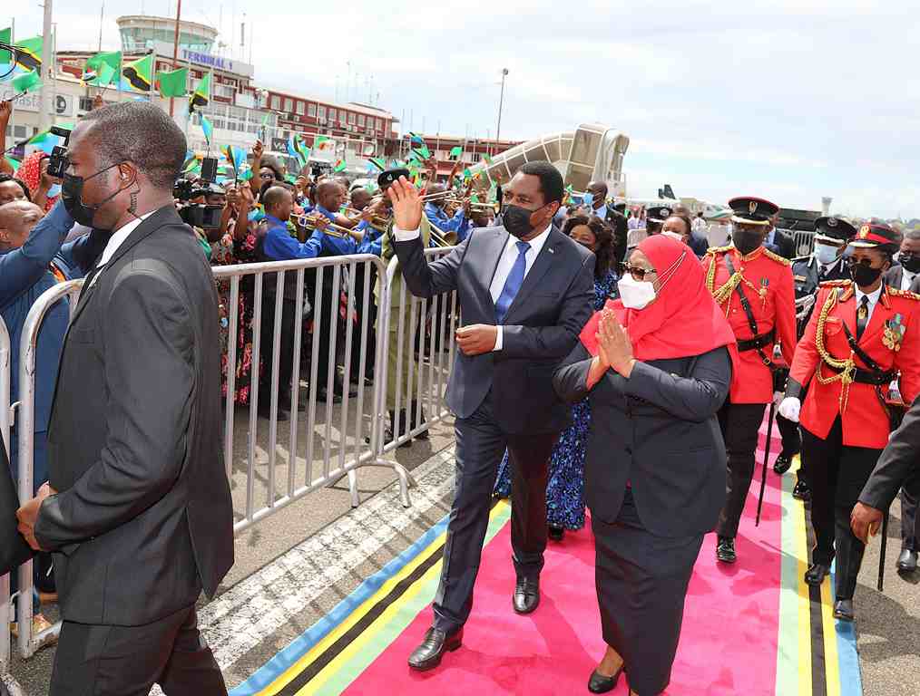 Rais wa Jamhuri ya Muungano wa Tanzania Mhe. Samia Suluhu Hassan akiwa na mgeni wake Rais wa Jamhuri ya Zambia Mhe. Hakainde Hichilema wakati wakiangalia vikundi mbalimbali vya ngoma za asili na matarumbeta vilivyokuwa vikitoa burudani wakati wa mapokezi katika uwanja wa Ndege wa Kimataifa wa Julius Nyerere (JNIA) Terminal one Jijini Dar es Salaam tarehe 02 Agosti, 2022.