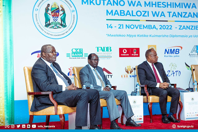Katibu Mkuu Wizara ya Mambo ya Nje na Ushirikiano wa Afrika Mashariki, Balozi Joseph Sokoine akiwasilisha hotuba yake kwa mabalozi (hawapo pichani). Mkutano huo umeanza leo Zanzzibar na utamalizika tarehe 21 Novemba, 2022.